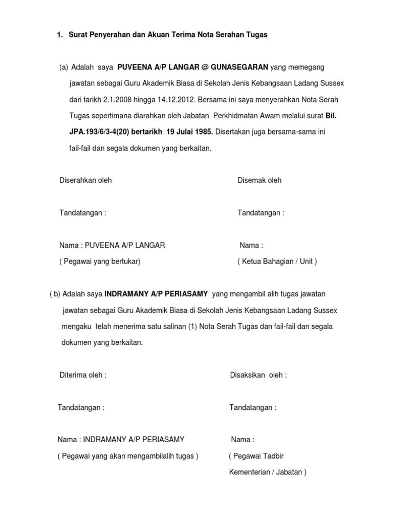 Surat peyerahan dan akuan terima i. Contoh surat tugas adalah surat yang dikeluarkan oleh perusahaan atau instansi. Terima kasih kepada cikgu dayang kerana sudi meluangkan masanya untuk memberi tunjuk ajar kepada saya (cikgu jee) yang akan mengambil alih tugas pengurusan perpustakaan smk st joseph. Di bawah ini bisa anda lihat sendiri bahwa jabatan yang diemban oleh orang yang diberi tugas adalah kepala. Surat serahan tugas / surat tugas diklat. Surat pernyataan cerai merupakan sebuah surat pernyataan yang. Surat kerterangan usaha adalah dokumen yang ditandangani dan di stempel lurah / kepala desa serta camat setempat yang berisikan keterangan dari pihak kelurahan dan kecamatan (tergantung. Lampiran senarai serahan tugas bi l 1. Documents similar to surat an serahan tugas emi. Surat tugas karyawan adalah surat tugas yang diberikan oleh atasan kepada karyawan. Surat serahan tugas nota serah tugas.borang kutipan dan serahan guru ke pejabat darjah. Surat tugas dipergunakan sebagai pengesahan formil dalam melaksanakan pekerjaan dimaksud. Pada zaman modern, ternyata tidak mengurangi eksistensi surat.